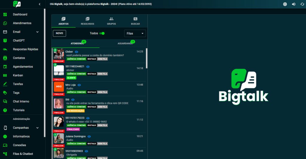 Apresentamos a BIGTALK, uma ferramenta de CRM poderosa e abrangente, projetada para elevar o gerenciamento de relacionamento com o cliente a um novo patamar. Desenvolvida com recursos avançados, a BIGTALK oferece uma variedade de funcionalidades projetadas para simplificar e aprimorar as interações com os clientes.