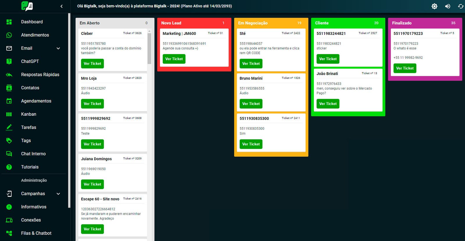 A organização de chamados (tickets) na BIGTALK é simplificada, com recursos avançados para atribuição, priorização e acompanhamento de solicitações dos clientes. Você pode categorizar, filtrar e resolver tickets de forma eficiente, garantindo um atendimento de alta qualidade e satisfação do cliente.