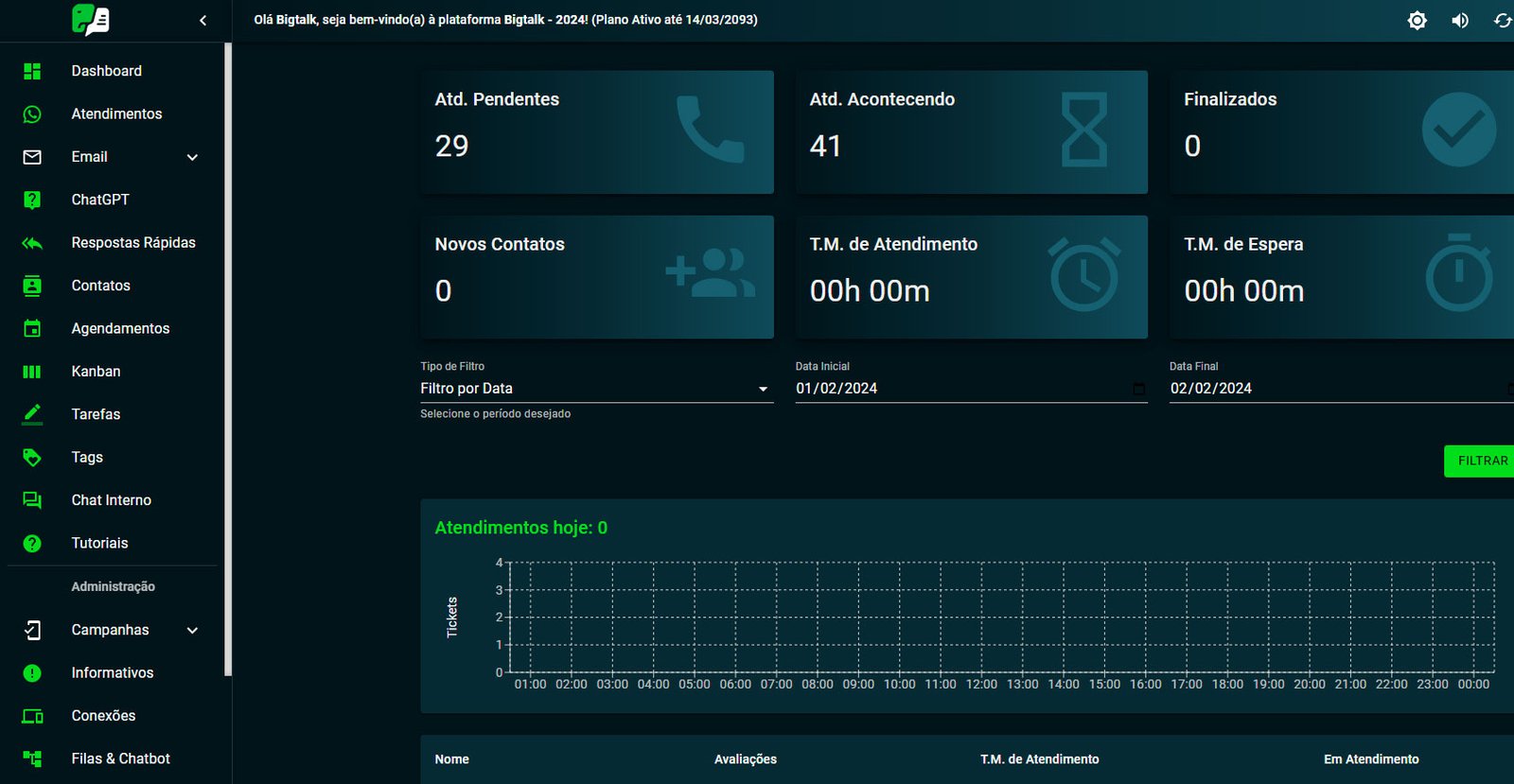 Com os relatórios integrados, a BIGTALK oferece insights valiosos sobre o desempenho da sua equipe de atendimento ao cliente, incluindo tempo médio de atendimento e análises por período. Esses dados permitem que você identifique áreas de melhoria, avalie o desempenho da sua equipe e tome decisões informadas para otimizar as operações do seu negócio.